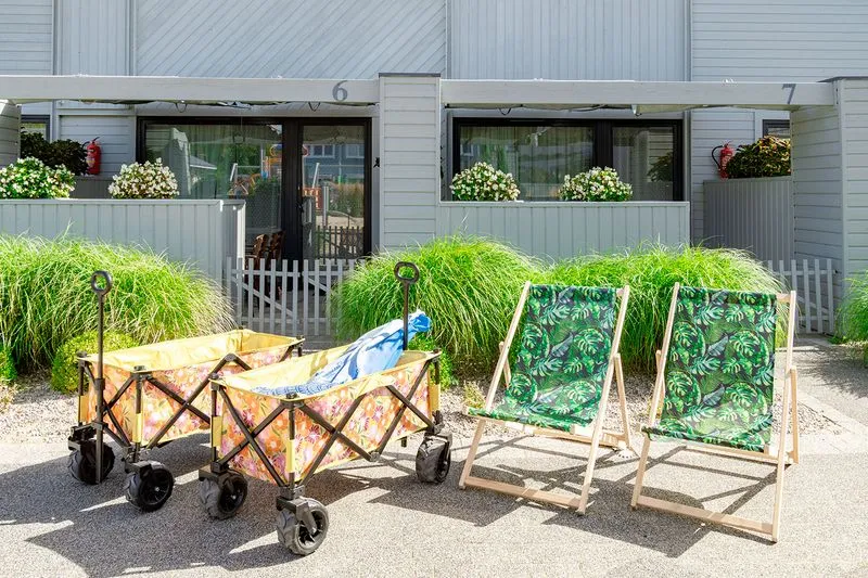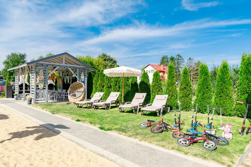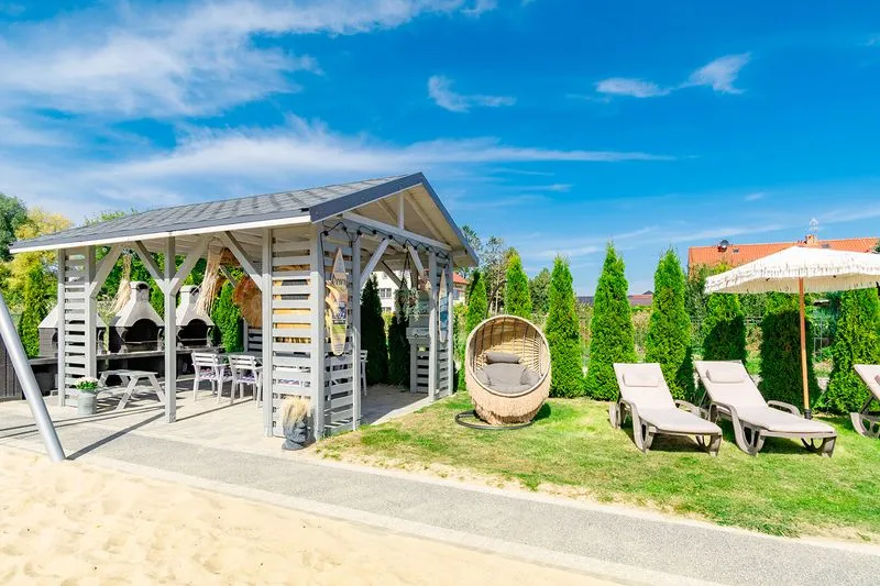 Z myślą o wypoczynku nad morzem domek został wyposażony w praktyczne udogodnienia, takie jak parawan, dwa leżaki, koc plażowy i wózek, który ułatwi spacer na plażę i przewiezienie wszystkimi potrzebnych rzeczy.