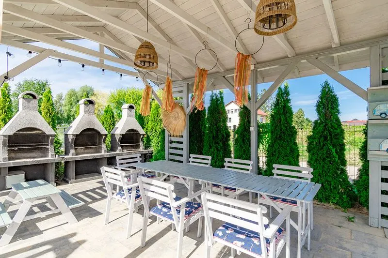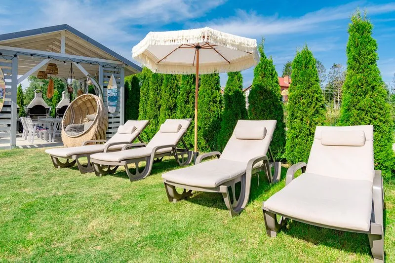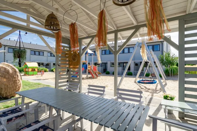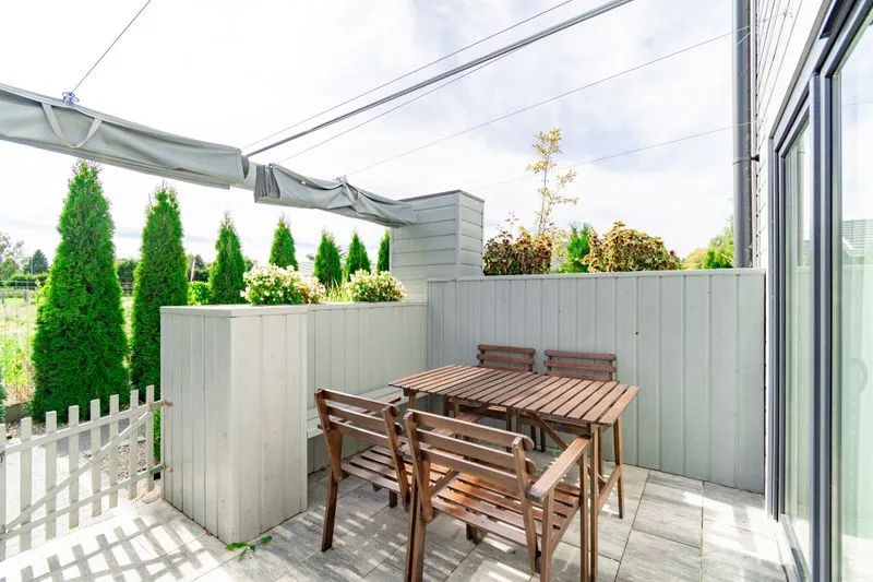 Każdy domek posiada prywatny taras z meblami ogrodowymi, idealny do porannej kawy lub wieczornego relaksu i rozkładane żagle, które zapewniają ochronę przed słońcem w ciepłe, letnie dni.