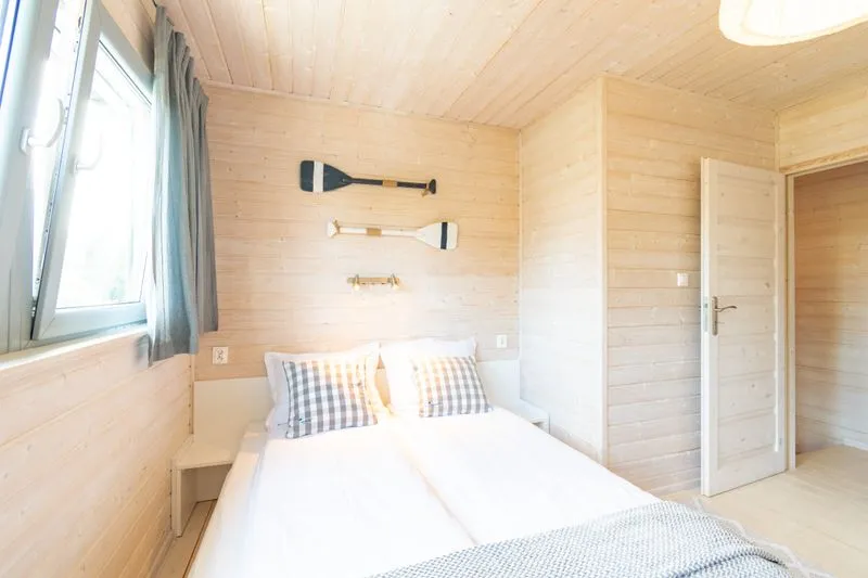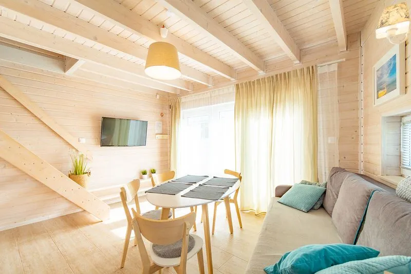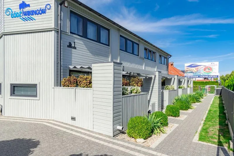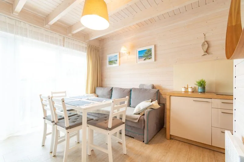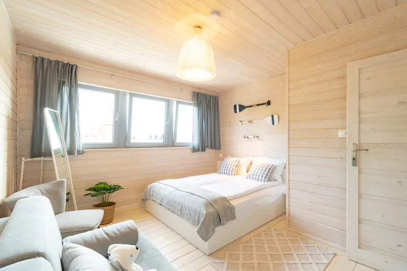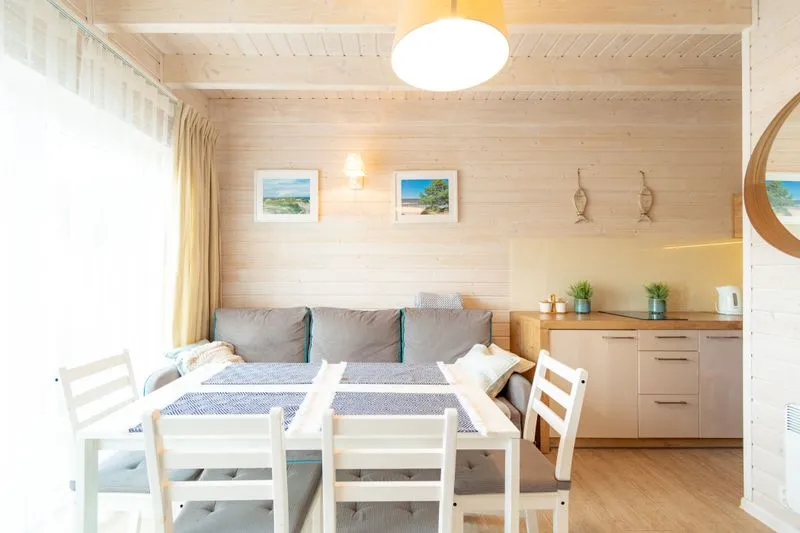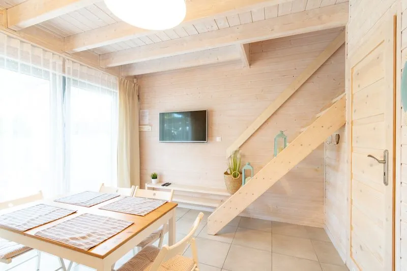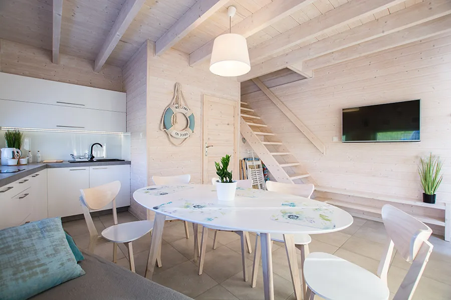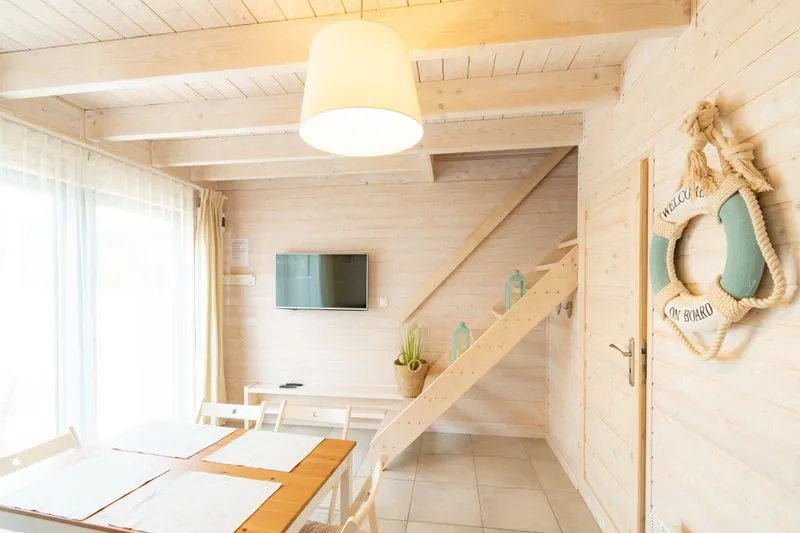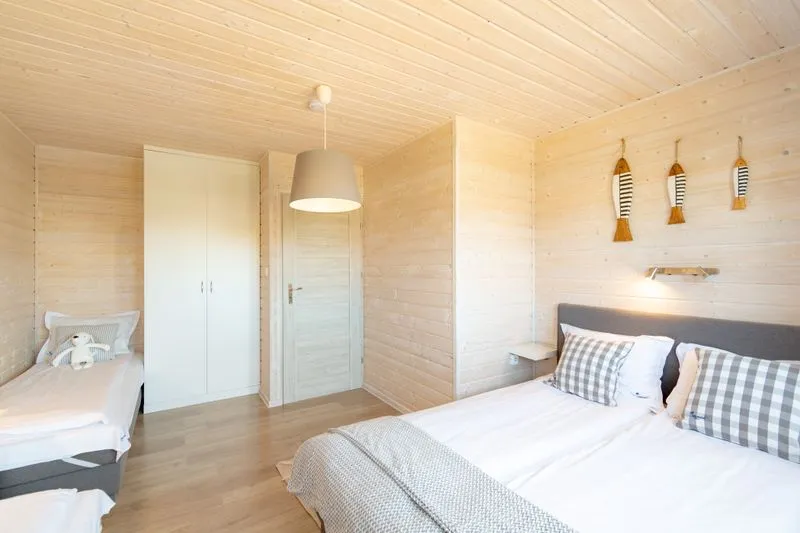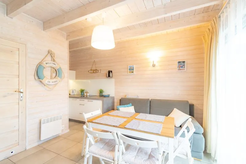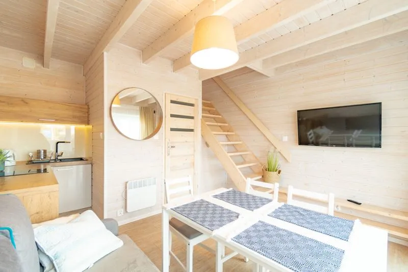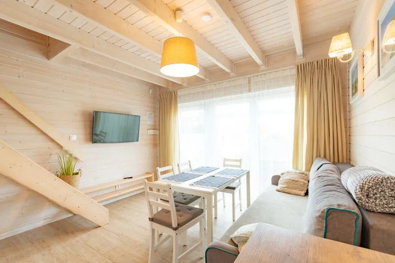 Łódź Wikingów to drewniane, piętrowe domki w stylu skandynawskim, łączące minimalizm z naturalnym drewnem. Nowoczesne aranżacje i ciepłe akcenty w kolorach morskiej wody i złocistego piasku tworzą przytulne wnętrze, idealne dla osób ceniących wygodę.