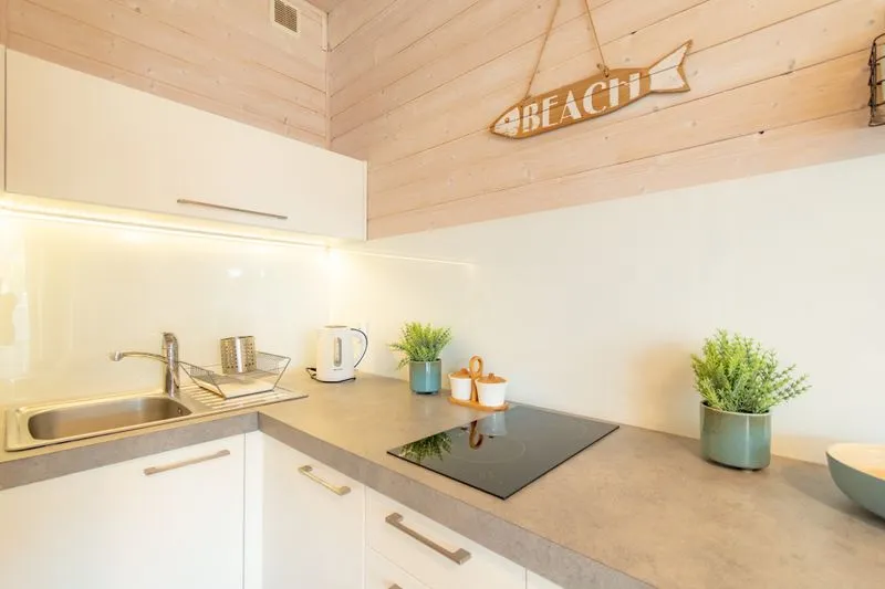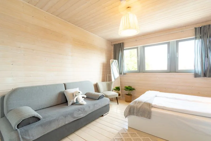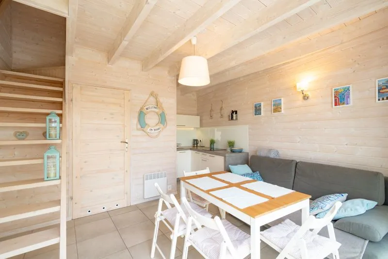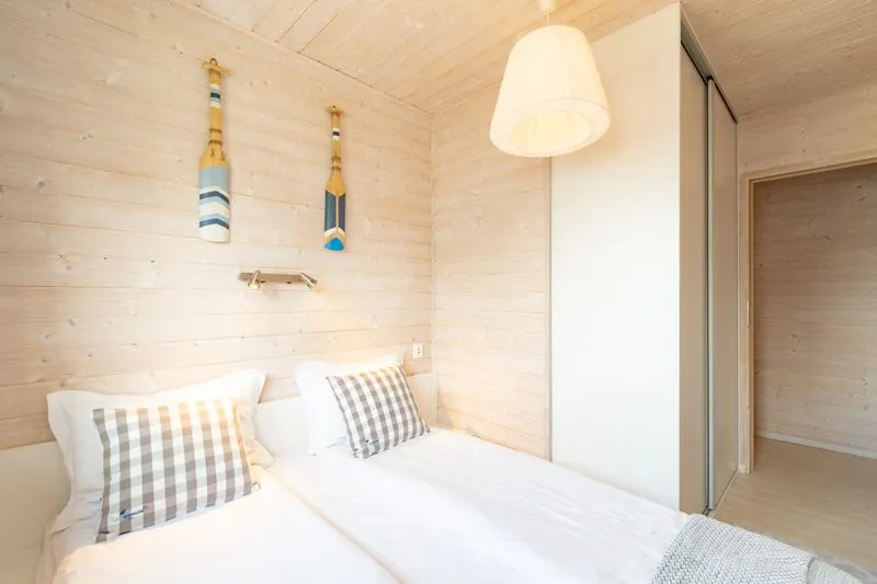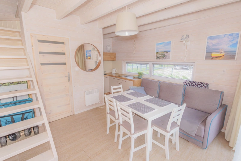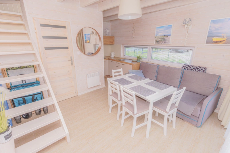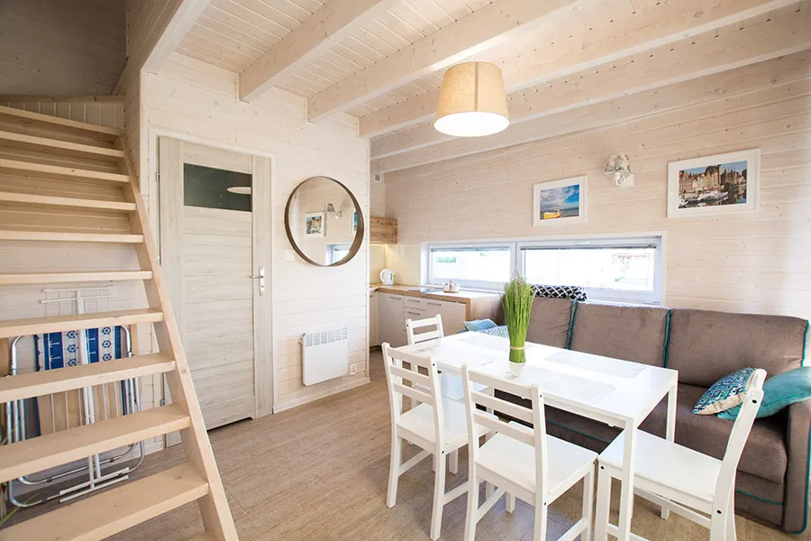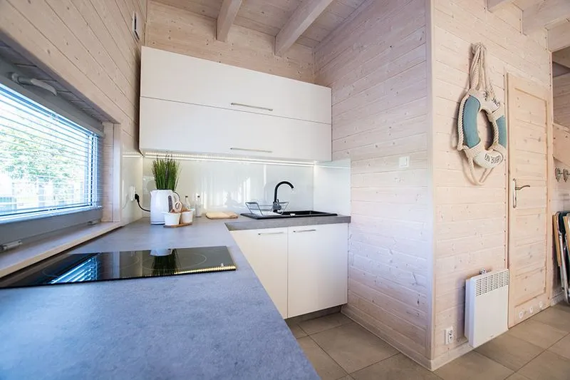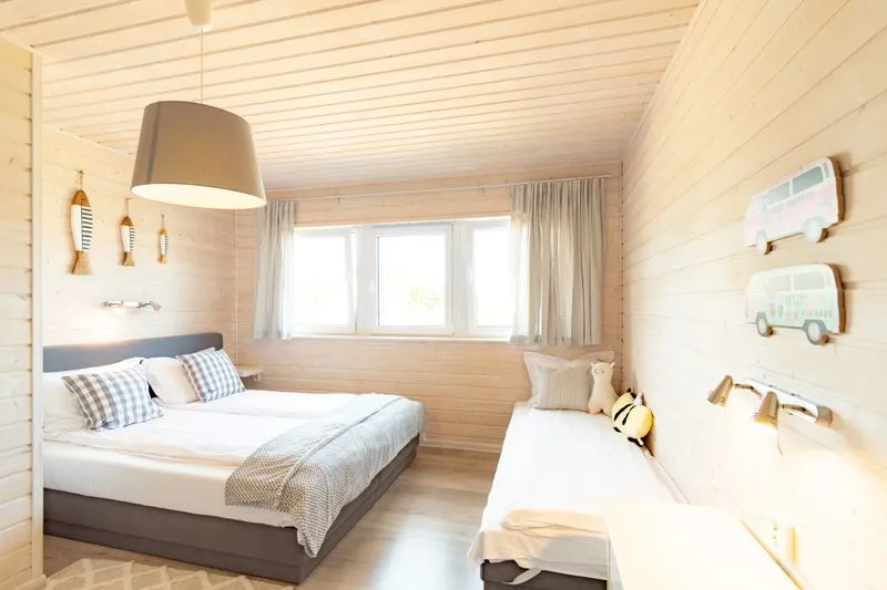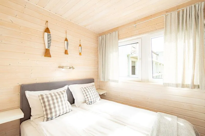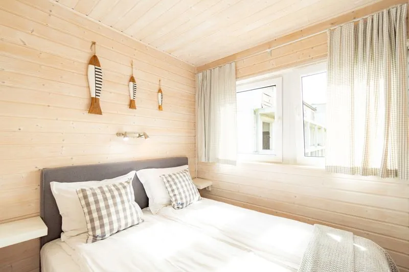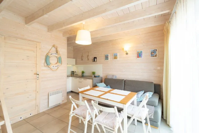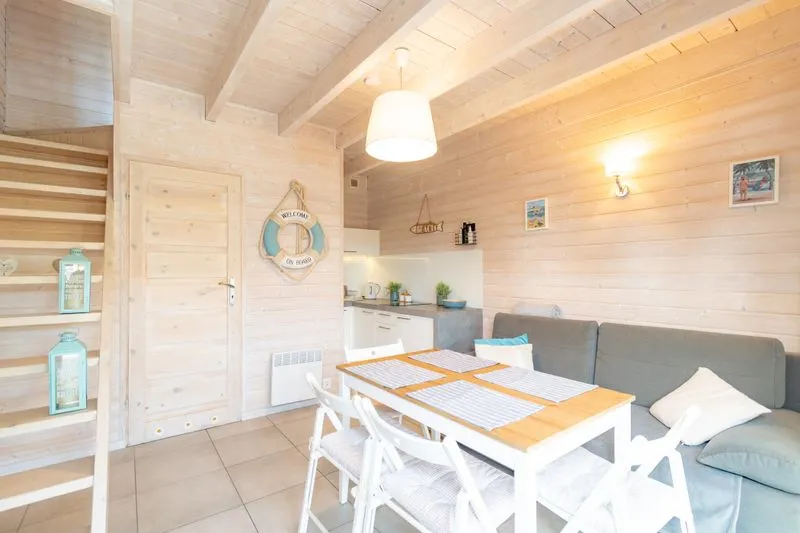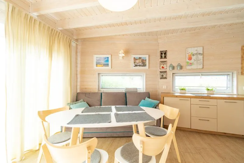 Łódź Wikingów to drewniane, piętrowe domki w stylu skandynawskim, łączące minimalizm z naturalnym drewnem. Nowoczesne aranżacje i ciepłe akcenty w kolorach morskiej wody i złocistego piasku tworzą przytulne wnętrze, idealne dla osób ceniących wygodę.