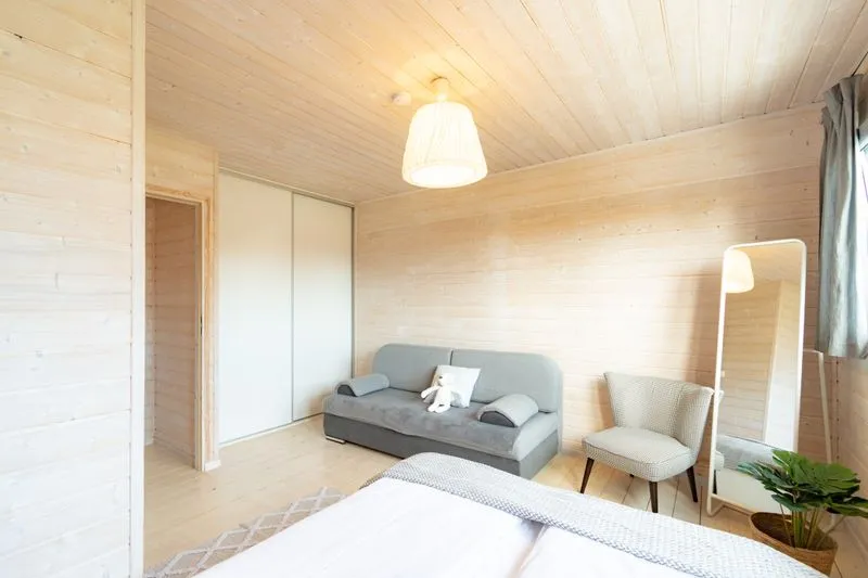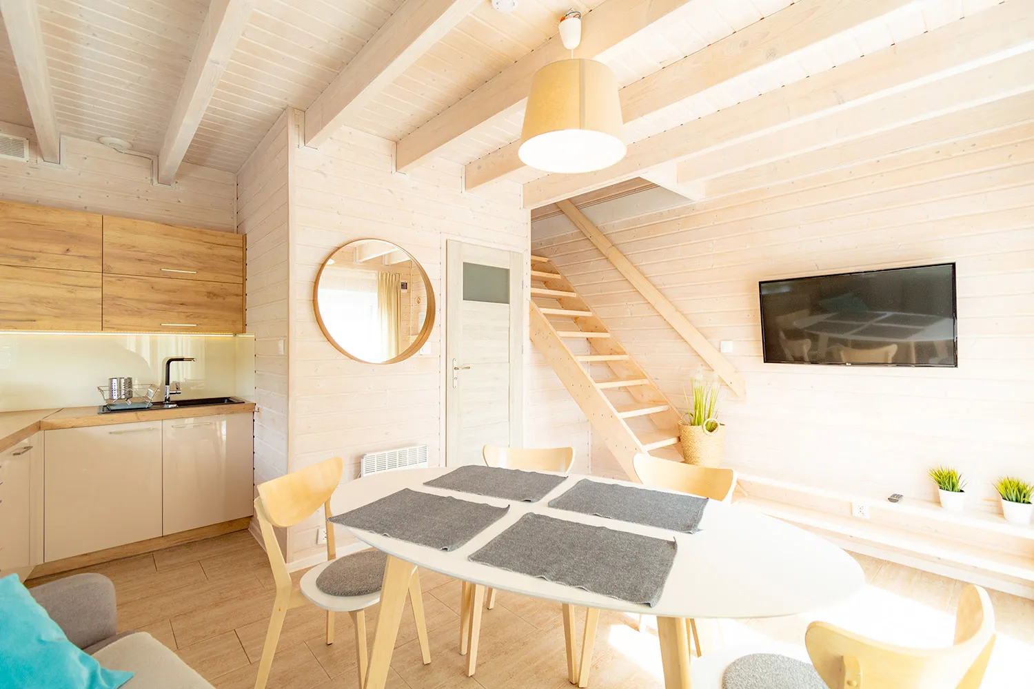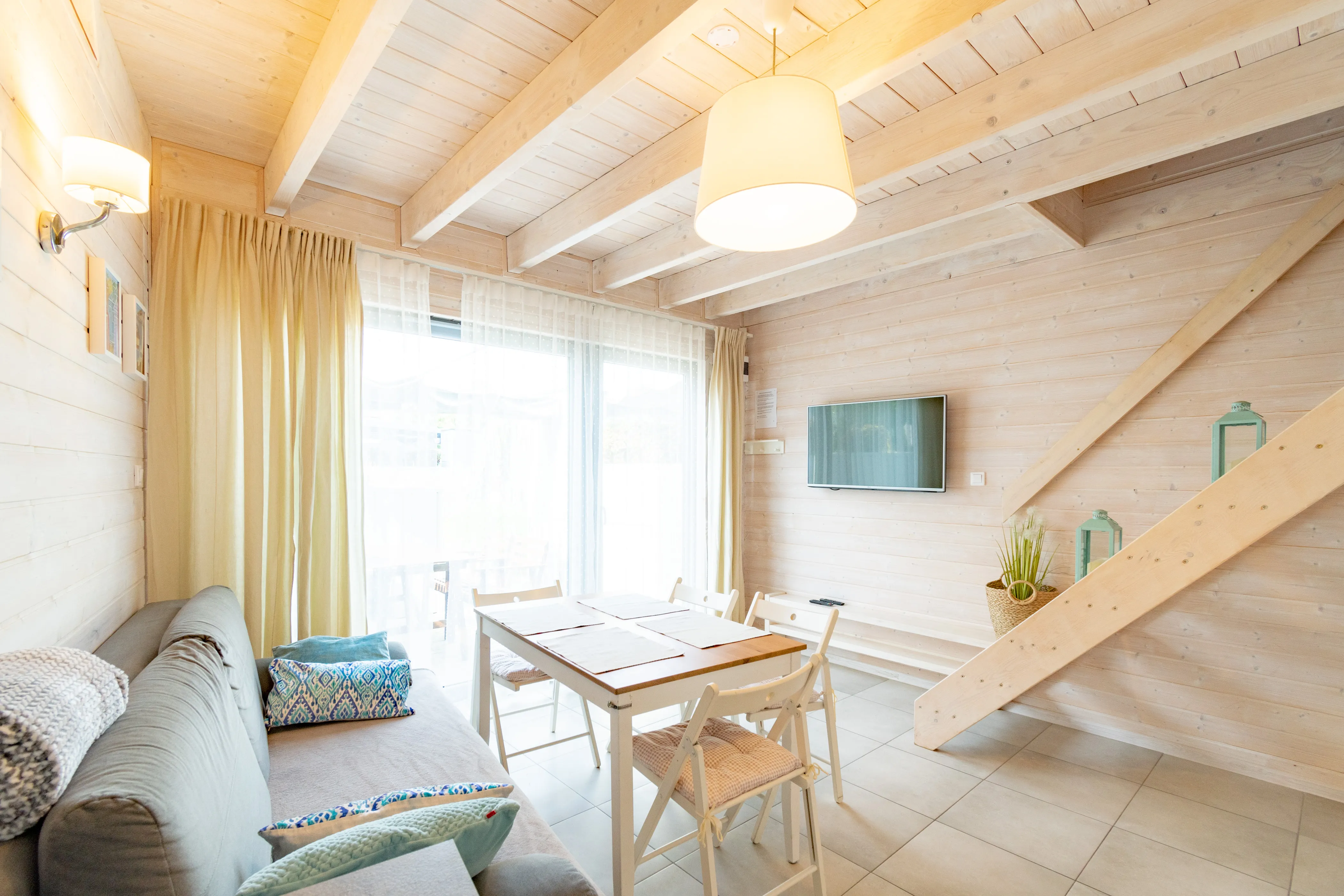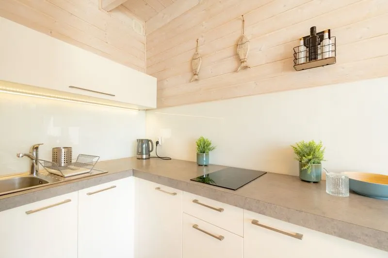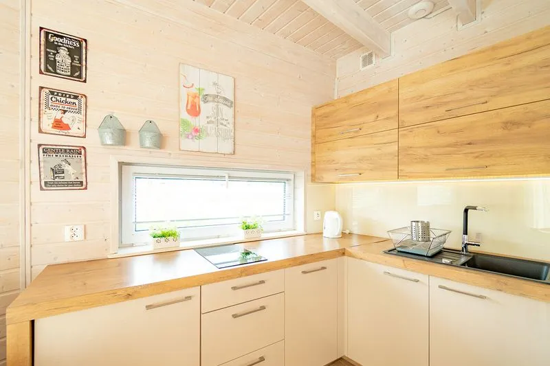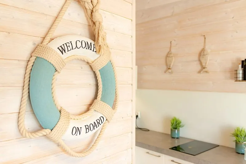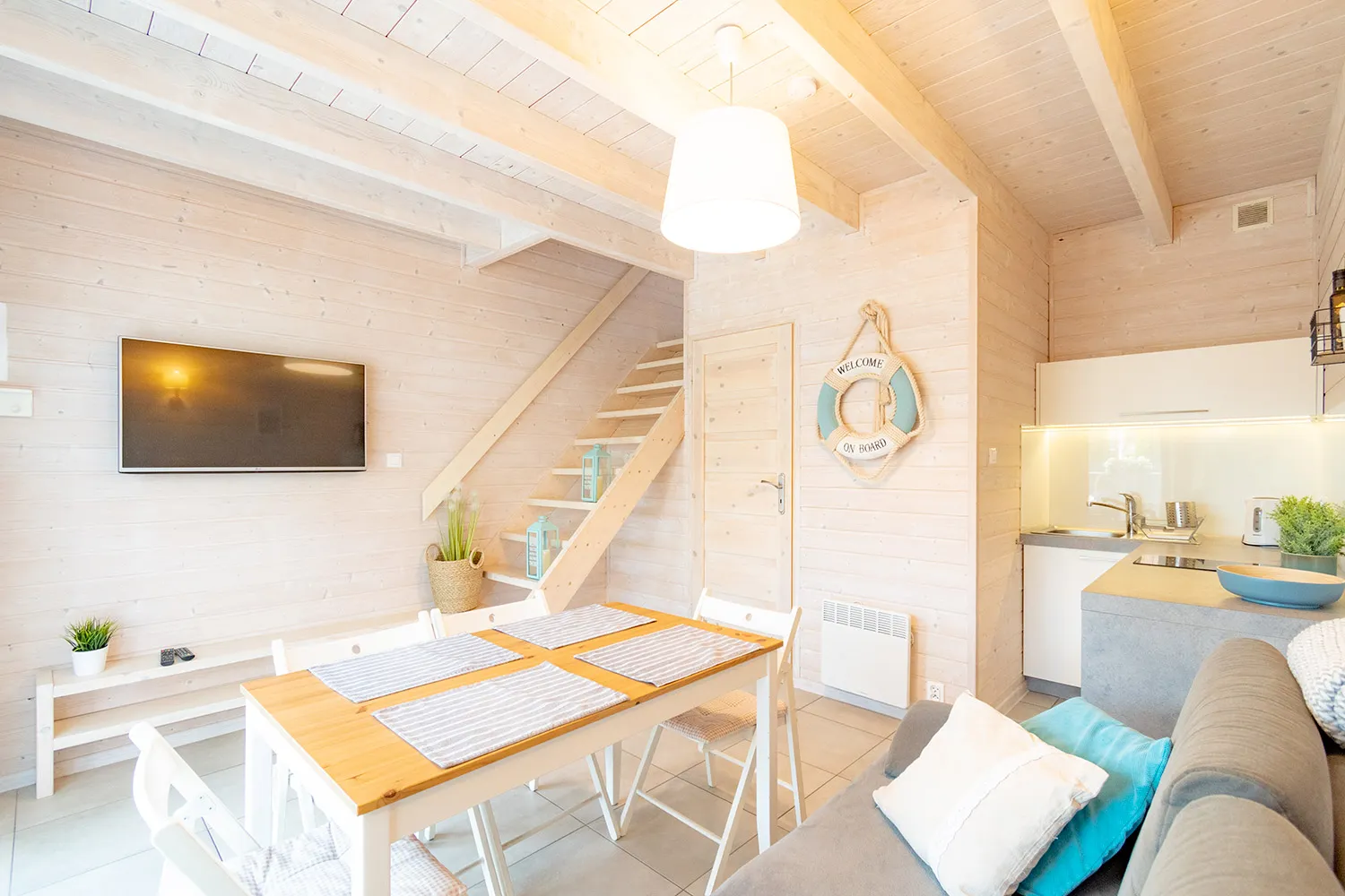 Łódź Wikingów to drewniane, piętrowe domki w stylu skandynawskim, łączące minimalizm z naturalnym drewnem. Nowoczesne aranżacje i ciepłe akcenty w kolorach morskiej wody i złocistego piasku tworzą przytulne wnętrze, idealne dla osób ceniących wygodę.