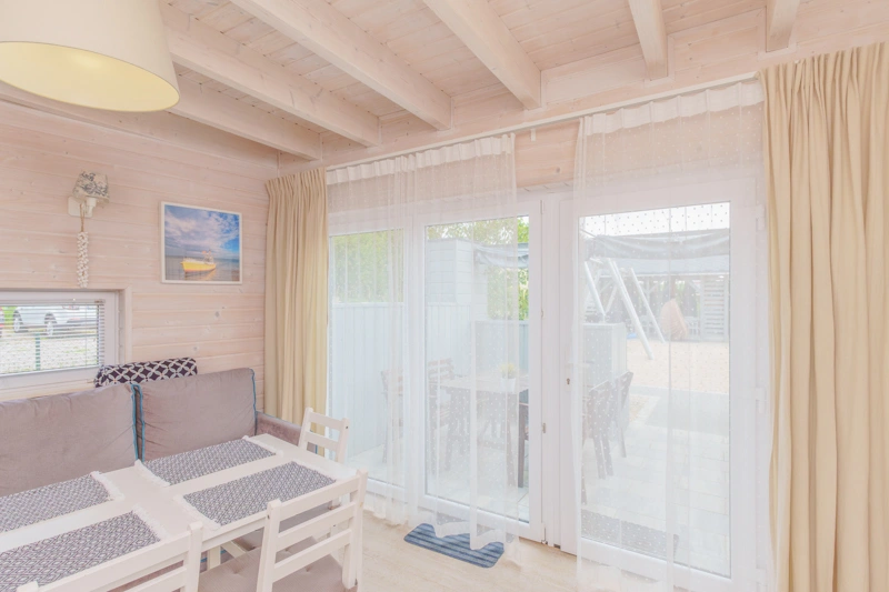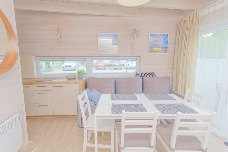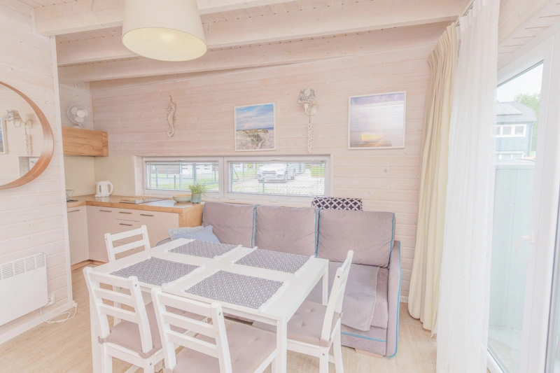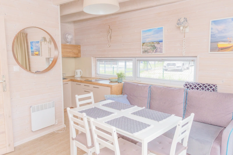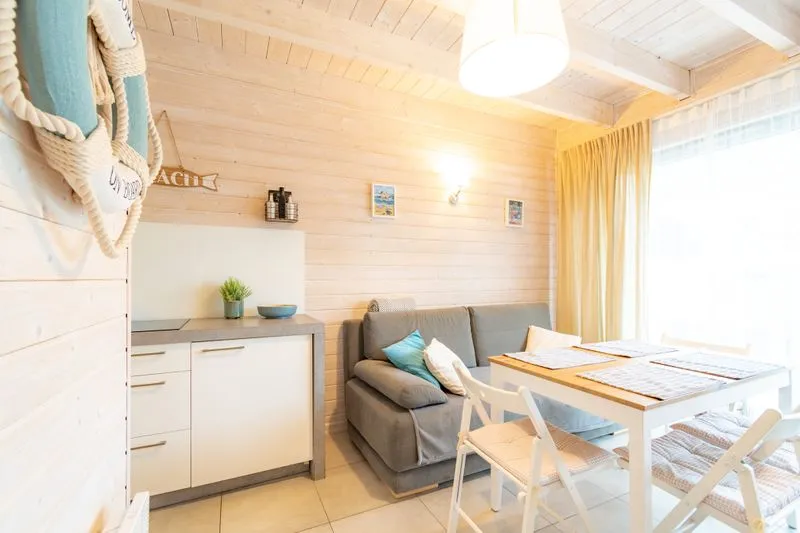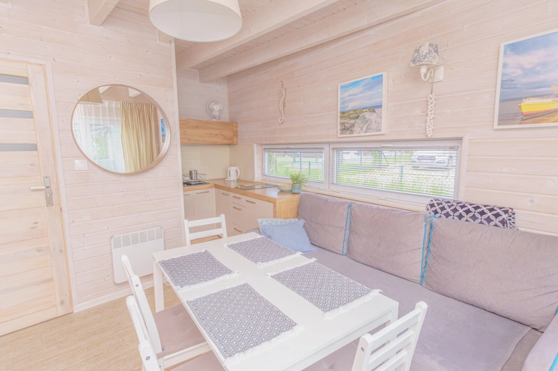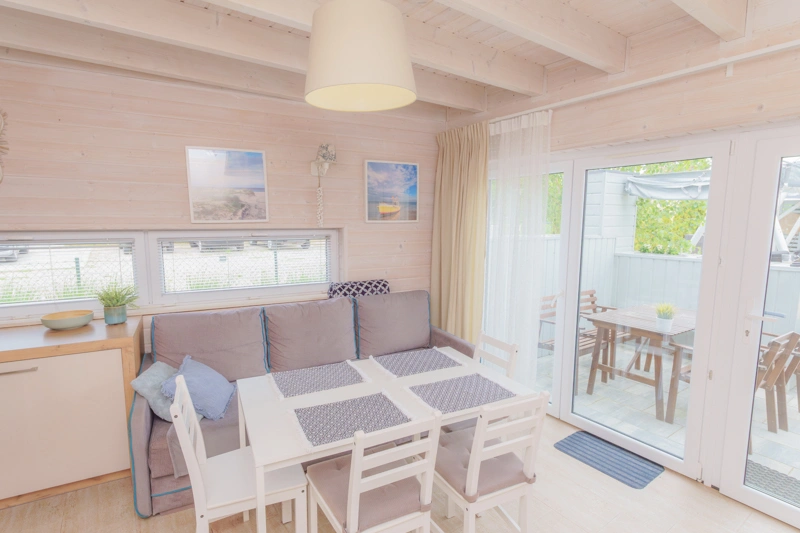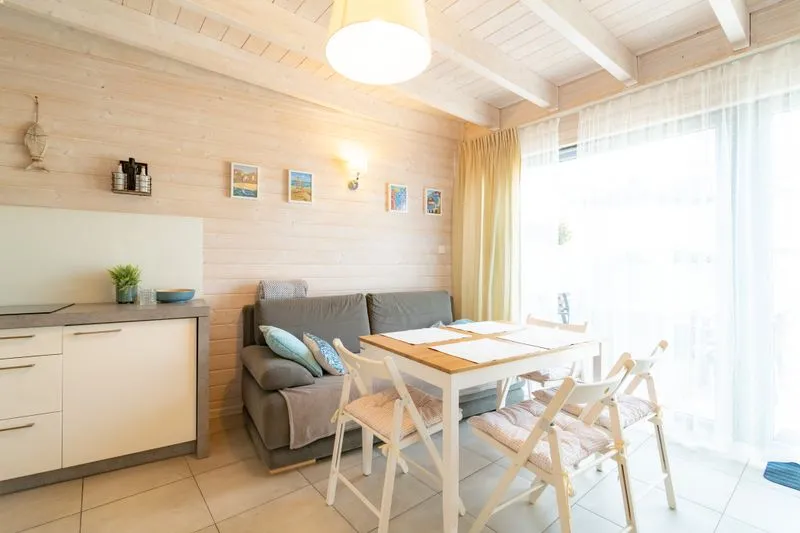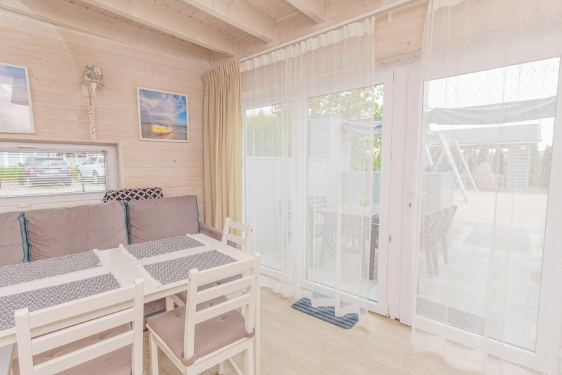 W salonie znajduje się rozkładana sofa, która może służyć jako dodatkowe miejsce do spania dla dwóch osób. Znajdziesz tam również stół z krzesłami oraz telewizor. Duże okna sprawiają, że wnętrze jest jasne, przestronne i doskonale doświetlone, wprowadzając do pomieszczeń przyjemną atmosferę.
