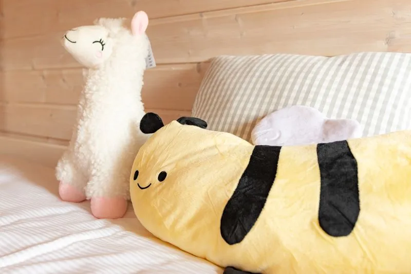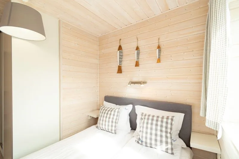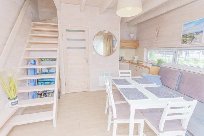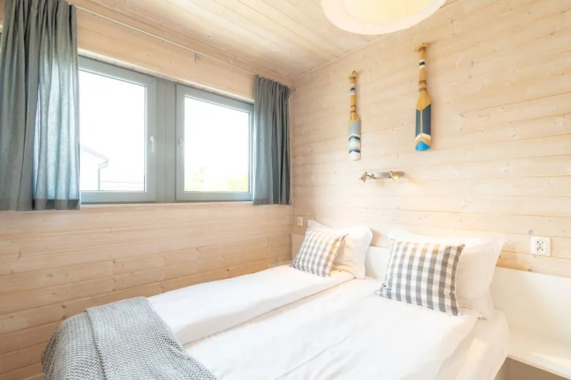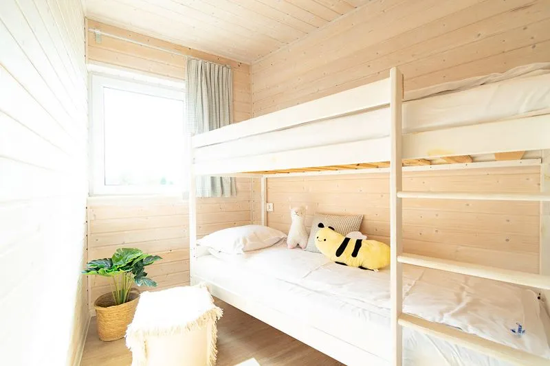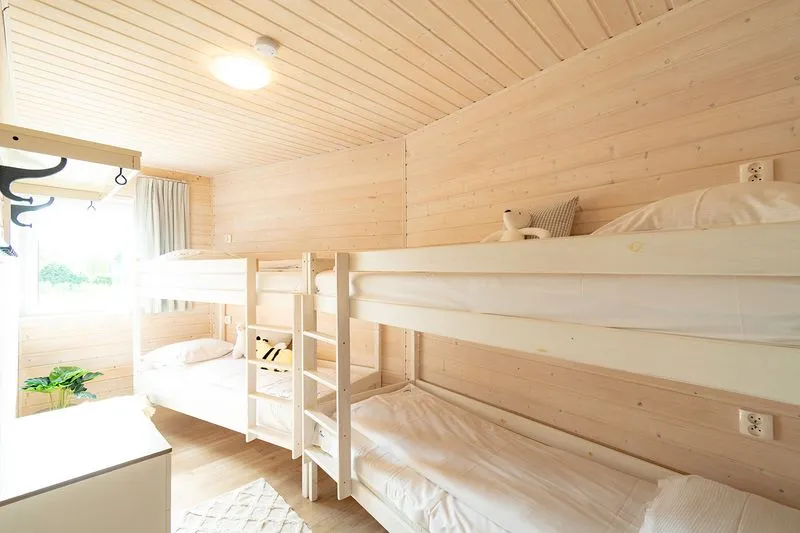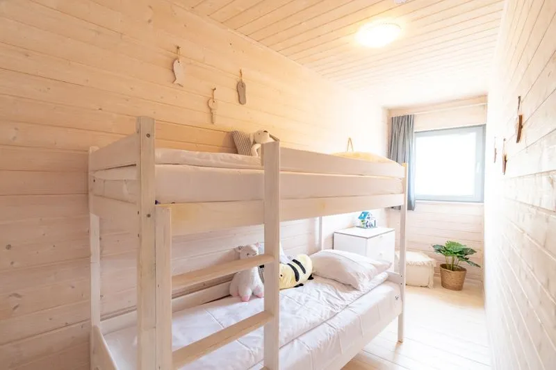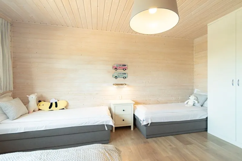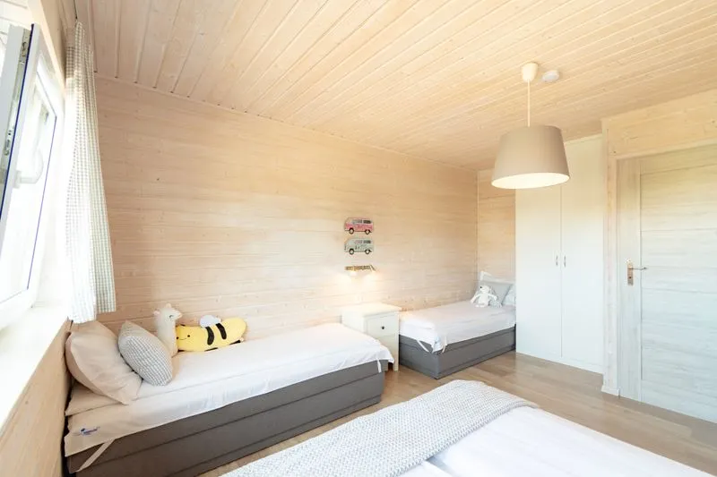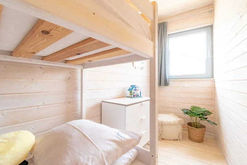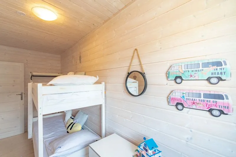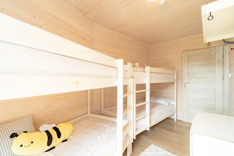 Ten domek oferuje na piętrze dwie sypialnie. W pierwszej znajduje się łóżko małżeńskie oraz szafa, a w drugiej dwa łóżka piętrowe, co sprawia, że domek doskonale nadaje się dla rodzin z większymi dziećmi.