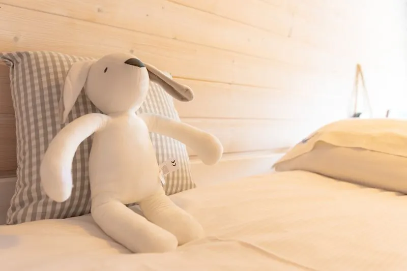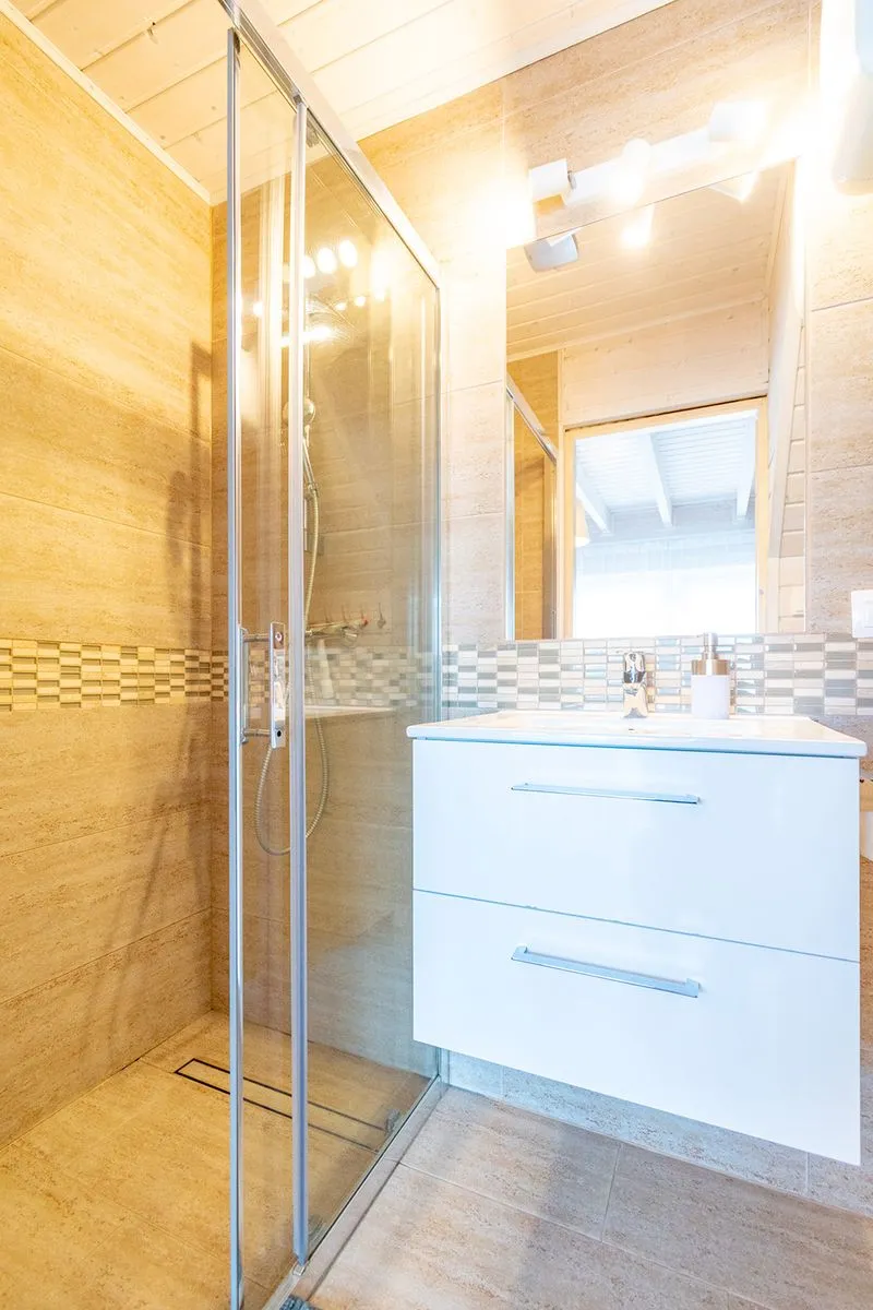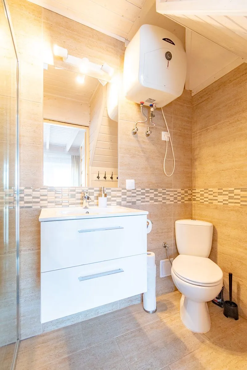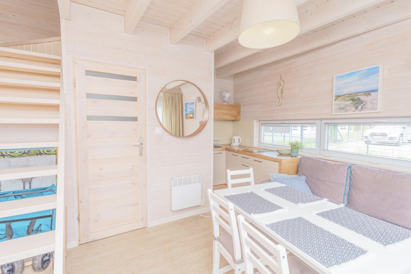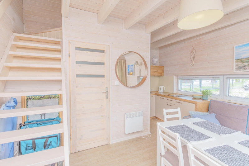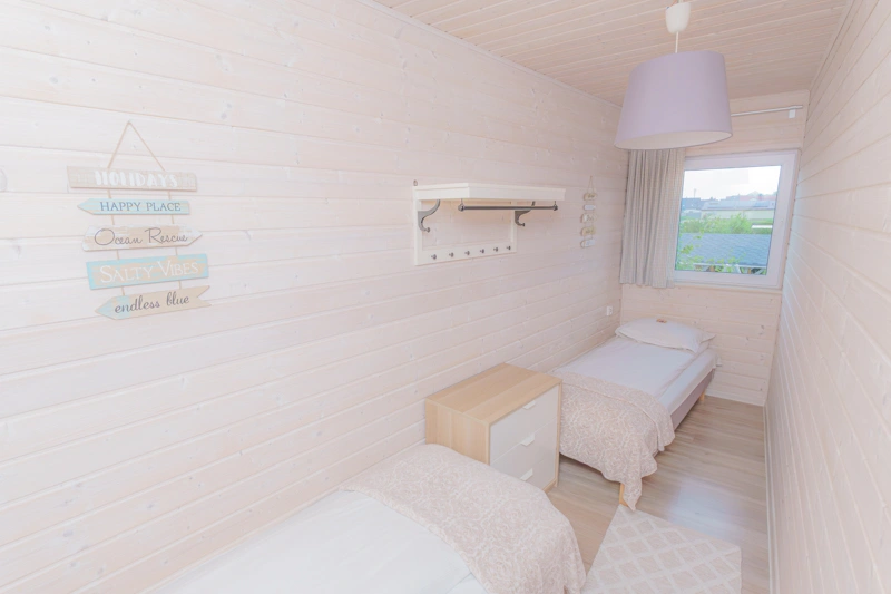 Ten domek, w porównaniu do domku 4 osobowego, oferuje dodatkową przestrzeń na piętrze, gdzie znajdują się dwie sypialnie. W pierwszej z nich znajduje się łóżko małżeńskie oraz pojemna szafa, natomiast druga sypialnia wyposażona jest w łóżko piętrowe – to idealna opcja dla rodzin z starszymi dziećmi. Wnętrza urządzone są w jasnych odcieniach bieli i błękitu, co wprowadza spokojną, wakacyjną atmosferę.