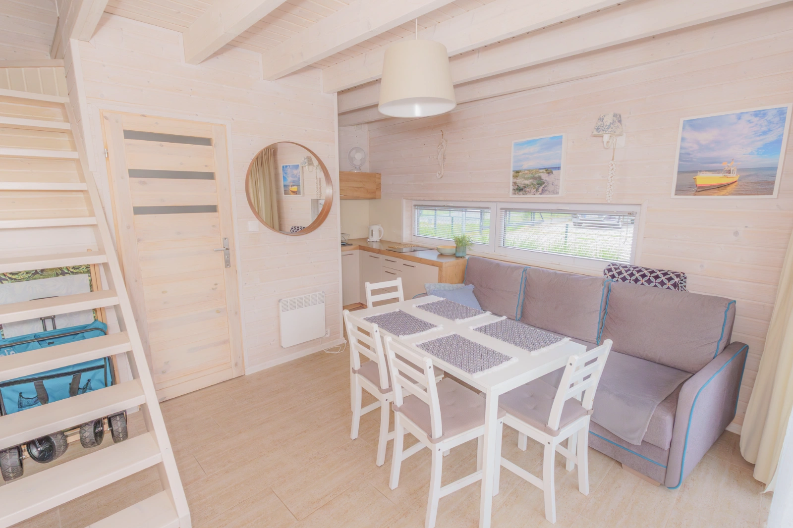 Wnętrze domku utrzymane jest w jasnych, przyjemnych kolorach bieli i błękitu, co nadaje mu lekki, nadmorski charakter.